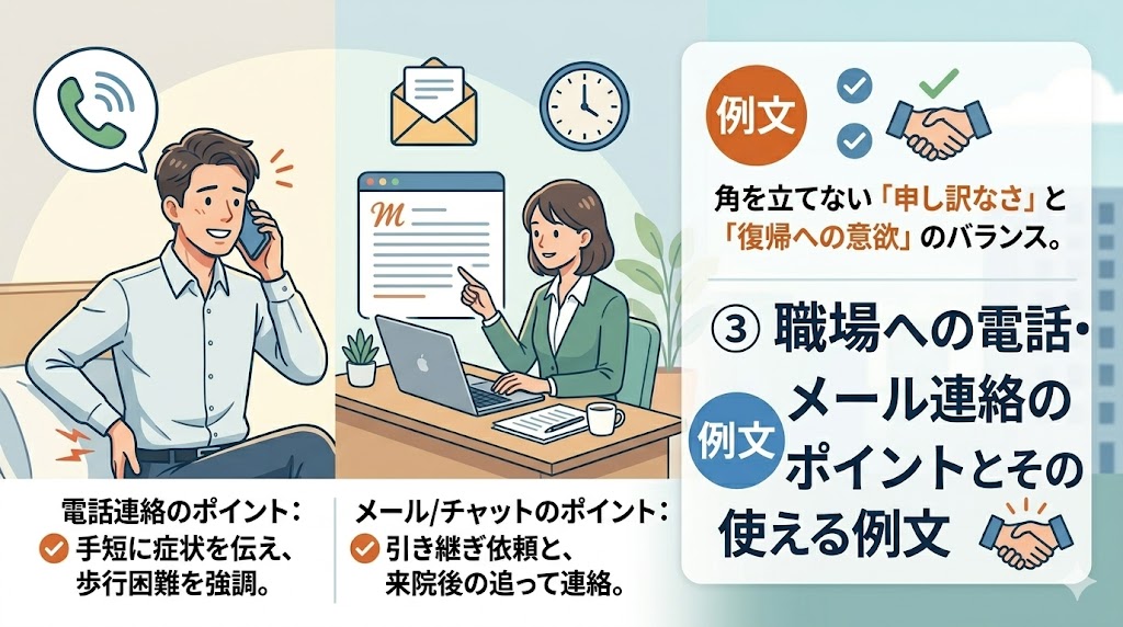 大切なのは「今の状況を正直に伝えること」と「復帰への前向きな姿勢を見せること」の2点です。相手に安心感を与えるためのポイントを、電話とメールそれぞれのパターンで整理してみました。