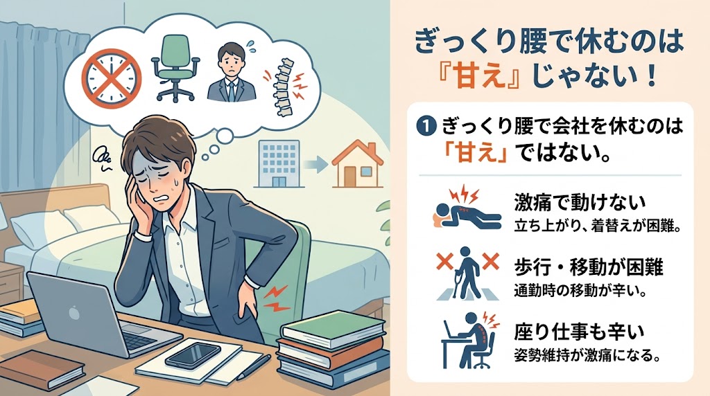 「これって甘えなのかな……」と、痛みに耐えながらスマホを握りしめているあなたへ。結論から言うと、ぎっくり腰で会社を休むのは決して自分を甘やかしているわけではありません。