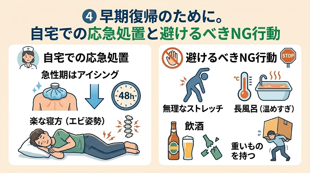 ④ 早期復帰のために。自宅での応急処置と避けるべきNG行動