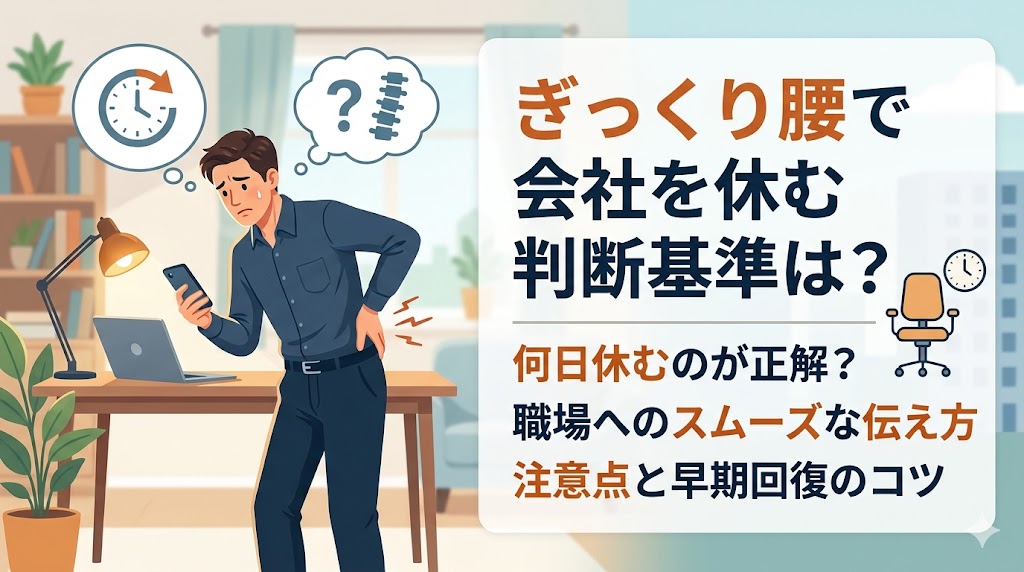 ぎっくり腰で会社を休むべきか悩む方へ。無理に出勤するリスクや、一般的に必要な休養期間(1〜3日)、職場へのスムーズな連絡例文を詳しく解説します。早期回復のための過ごし方や、再発防止のストレッチも紹介。まずは本記事を読んで、最善の判断を下してください。