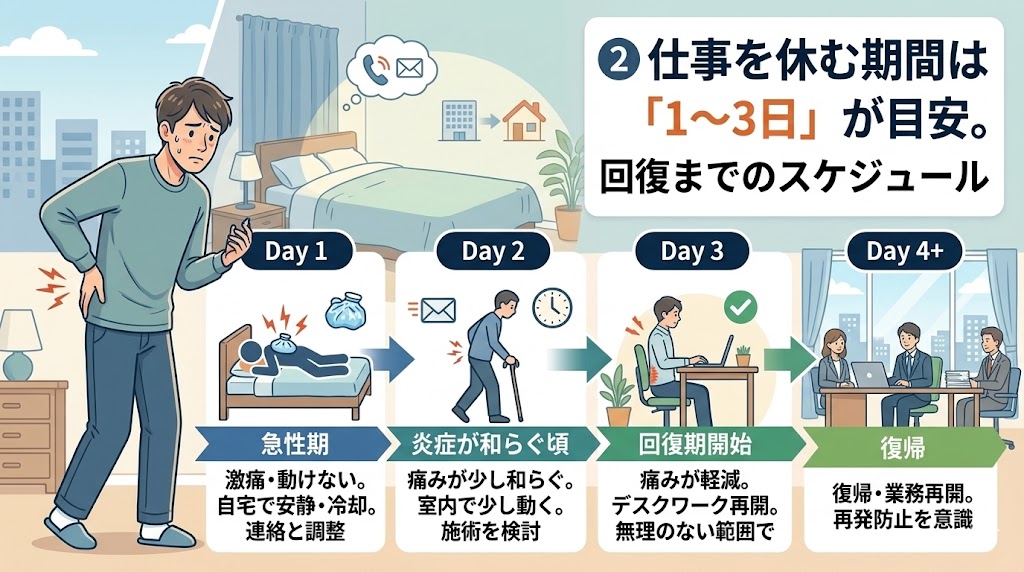 - 発症当日〜2日目: 炎症が強いため、無理に出勤せず自宅で楽な姿勢を保つ。