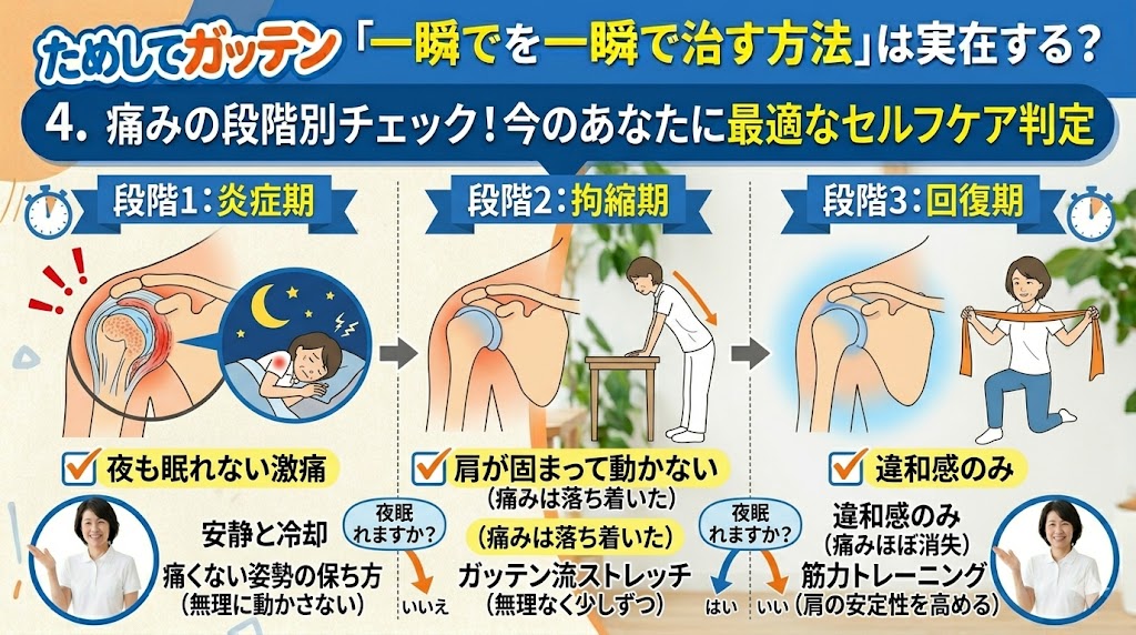「早く改善したいから、とにかく動かさなきゃ!」と焦っていませんか?実は五十肩には、その時々の状態に合わせた「正しい過ごし方」があると言われています。今の自分の痛みがどのステージにいるのかを知ることが、遠回りに見えて実は一番の近道になるかもしれません。