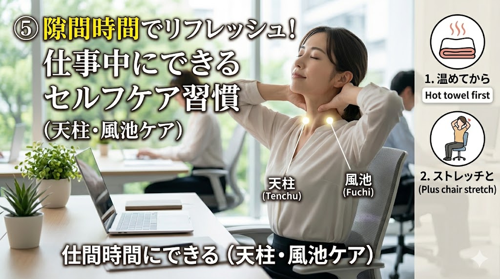 ⑤ 隙間時間でリフレッシュ!仕事中にできるセルフケア習慣