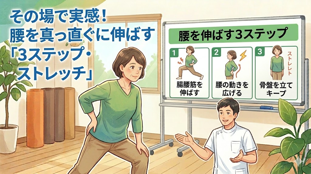 3. その場で実感!腰を真っ直ぐに伸ばすための「3ステップ・ストレッチ」