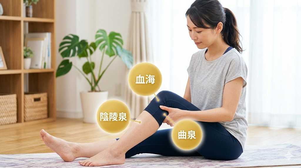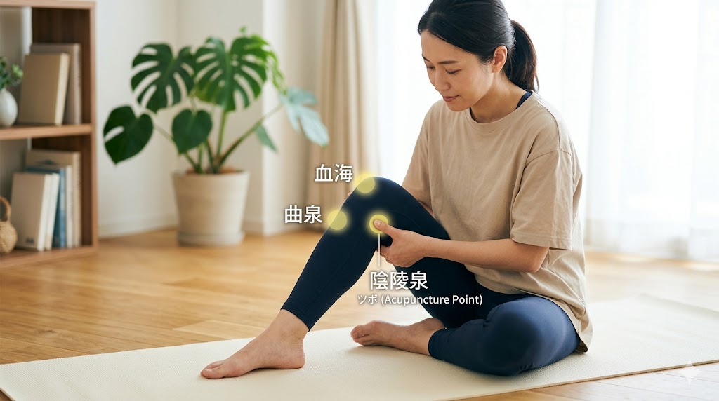ツボを探す時は、指の幅を基準にするのが一番の近道ですよ。「血海」ならお皿の内側の角から上へ指3本分、「陰陵泉」なら骨のキワを下からなぞって指が止まる場所、といった具合です。