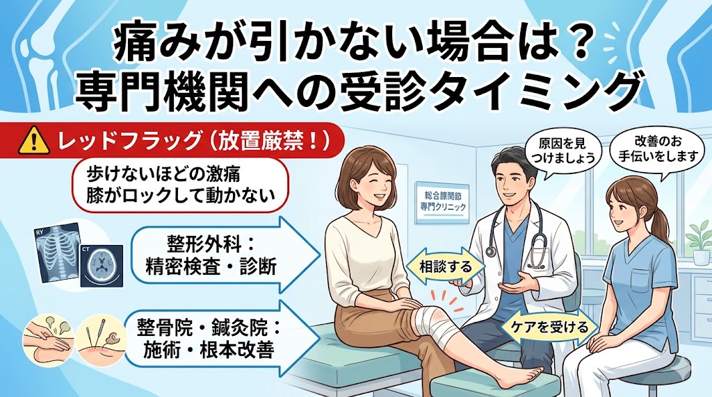 ツボ押しやセルフケアを続けても、なかなか膝の痛みが変わらないと不安になってしまいますよね。「もう少し様子を見れば改善するかな?」と我慢してしまいがちですが、実は早めに専門家を頼ったほうが良いサインがあるんです。