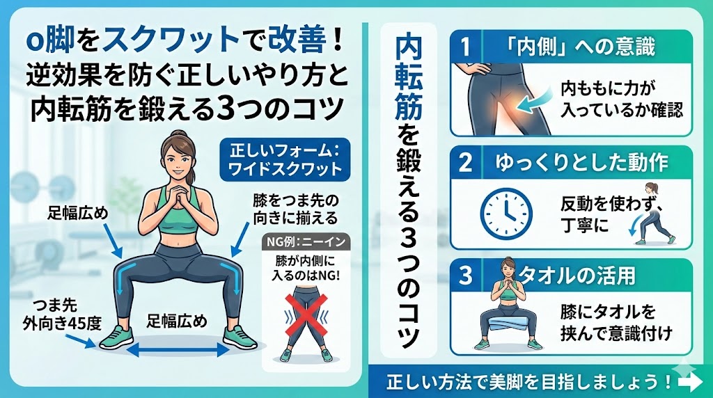 o脚をスクワットで改善!逆効果を防ぐ正しいやり方と内転筋を鍛える3つのコツ
